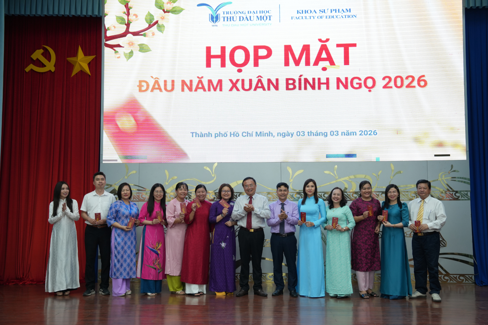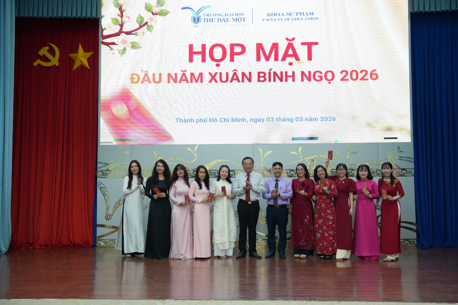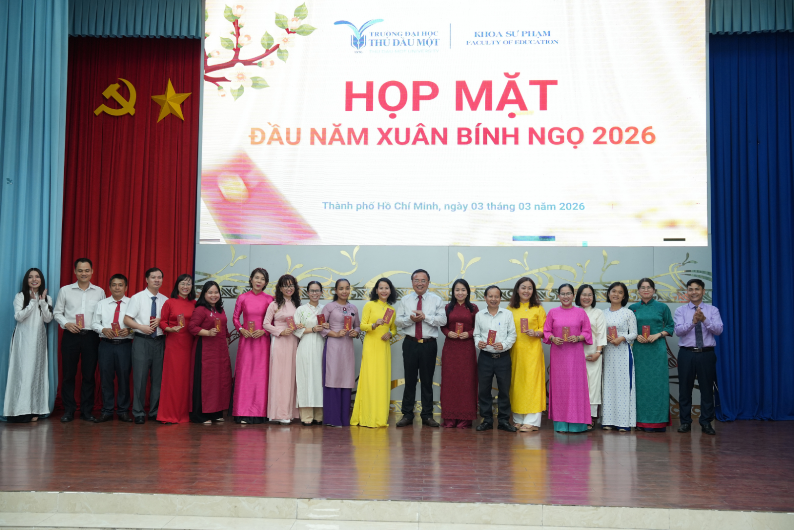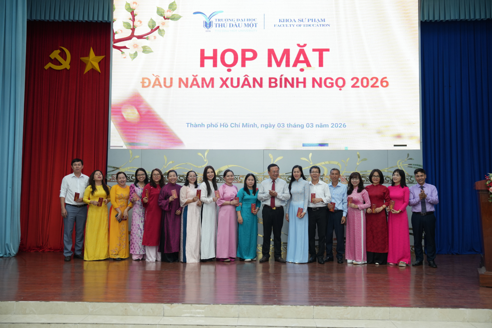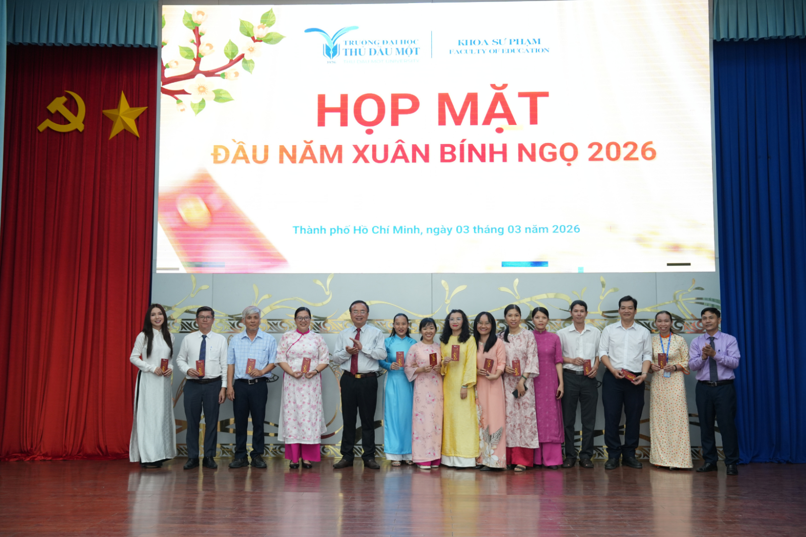 Nhằm tạo không khí gặp gỡ, giao lưu và khởi động các hoạt động trong năm mới 2026, chiều ngày 03/3/2026, Khoa Sư phạm, trường Đại học Thủ Dầu Một đã tổ chức buổi Họp mặt đầu Xuân Bính Ngọ năm 2026, tại Hội trường 2 của Trường. Tham dự chương trình về phía Lãnh đạo trường có TS. Đoàn Ngọc Xuân - Hiệu trưởng, cùng lãnh đạo các đơn vị trực thuộc Trường. Về phía lãnh đạo khoa có PGS.TS Đồng Văn Toàn - Trưởng khoa, TS. Tạ Anh Thư - Phó Trưởng khoa, cùng lãnh đạo các Ngành đào tạo, Bộ môn và toàn thể giảng viên, cán bộ của Khoa.