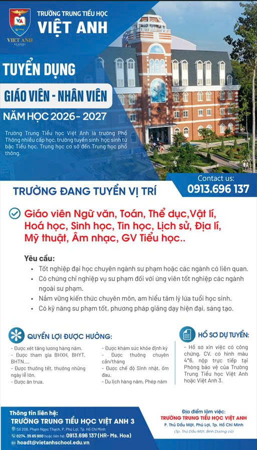 Trường Trung Tiểu học Việt Anh tuyển dụng Giáo viên - Nhân viên NH 2026-2027